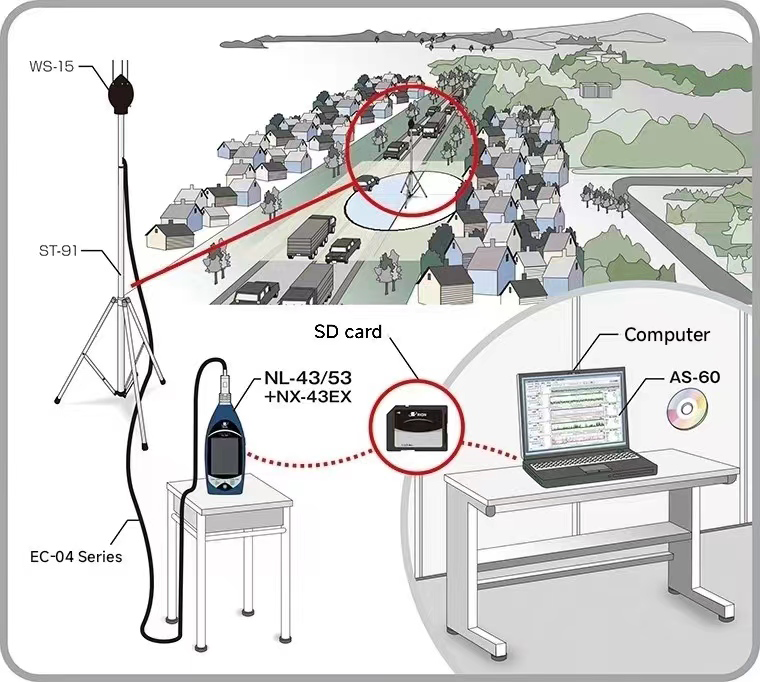 可使用手持式聲級計(jì)NL-43/53系列進(jìn)行短時間道路交通噪聲監(jiān)測。在聲級計(jì)NL-43/53上安裝可以自動存儲的功能擴(kuò)展程序NX-43EX。組合室外用防風(fēng)罩WS-15,安裝在三腳架上。也可以使用等級記錄器LR-07進(jìn)行聲級記錄。要在計(jì)算機(jī)上處理記錄的數(shù)據(jù),請使用環(huán)境測量數(shù)據(jù)管理軟件AS-60。在AS-60中,可以在確認(rèn)高噪聲區(qū)間的聲音的同時,處理要去除的聲音。