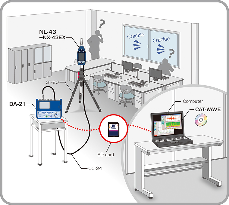 調(diào)查建筑物內(nèi)產(chǎn)生的異常噪聲或特殊噪聲,可使用NL-43/53的交流輸出功能,將信號(hào)輸入到DA-21并記錄波形數(shù)據(jù)。如果不知道什么時(shí)候會(huì)出現(xiàn)噪聲,可將AC適配器連接到聲學(xué)測(cè)量?jī)x并使用DA-21實(shí)行觸發(fā)器收錄。記錄的波形數(shù)據(jù)可以導(dǎo)入到FFT分析程序中進(jìn)行分析頻率,并根據(jù)數(shù)據(jù)特征,發(fā)生時(shí)間帶以及其他情況綜合推測(cè)聲源。此外,波形分析軟件AS-70和波形分析軟件CAT-WAVE可以對(duì)波形數(shù)據(jù)進(jìn)行二次離線分析(FFT,倍頻程分析等)。