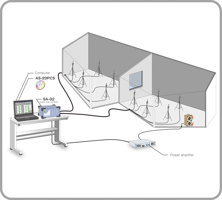 • 相鄰的兩個(gè)房間中,一個(gè)混響室是聲源室,另一個(gè)是聲音接收室。將揚(yáng)聲器和麥克風(fēng)放在聲源室中,將麥克風(fēng)放在聲音接收室中,然后將其連接到SA-02M。測(cè)量由空氣噪聲和地板撞擊聲音阻擋性能測(cè)量軟件AS-20PC5控制。提前測(cè)量背景噪音和混響時(shí)間。當(dāng)從聲源室中揚(yáng)聲器發(fā)出聲音,并在AS-20PC5上開始測(cè)量時(shí),自動(dòng)執(zhí)行設(shè)定重復(fù)次數(shù)的測(cè)量。 混響時(shí)間測(cè)量中各混響室的聲壓級(jí)可以在每個(gè)倍頻程或1/3倍頻程的條件下進(jìn)行測(cè)量。除了一系列的自動(dòng)測(cè)量外,還可以重做特定某次的測(cè)量。 最后計(jì)算出隔聲量。