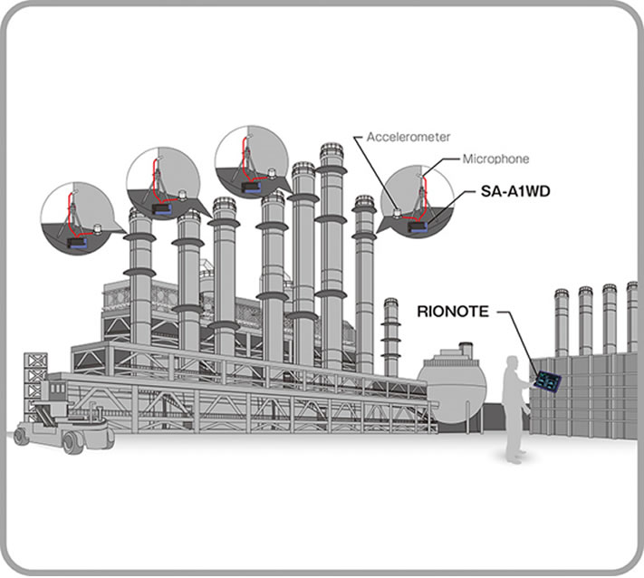 例圖,在廠區(qū)的高處設置麥克風、加速度傳感器、SA-A1WD的多個部位,使用SA-A1進行遠距離測量的示例。測量數(shù)據(jù)進行無線通信,無線電纜延長,測量系統(tǒng)的設置能夠簡潔化。