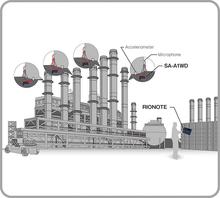 圖中展示了工廠里的遠(yuǎn)程測(cè)量系統(tǒng)的概況,其中麥克風(fēng)和加速度傳感器以及 SA-A1WD 單元位于多個(gè)高處。