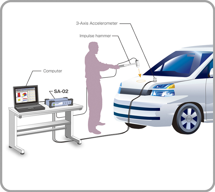 • 需要同時測量三個軸的傳遞函數(shù)時,也可以使用三方向加速度傳感器,脈沖錘和多通道分析處理器SA-02。