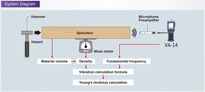 • 通過 VA-14 振動分析儀和麥克風(安裝 VX-14S 擴展程序)測量敲擊木材的聲音,可根據聲頻、木材體積和密度計算楊氏模量。楊氏模量是表征材料變形難易程度和剛度的指標,應用于結構分析、強度計算、特征值分析等領域。合理設定楊氏模量,能避免產品變形量和應力分布的預測與實際表現(xiàn)偏差過大。