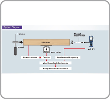 通過 VA-14 振動(dòng)分析儀和麥克風(fēng)(安裝 VX-14S 擴(kuò)展程序)測量敲擊木材的聲音,可根據(jù)聲頻、木材體積和密度計(jì)算楊氏模量。